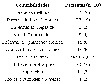 Todos los pacientes presentaron por lo menos una comorbilidad subyacente, siendo las condiciones coexistentes más frecuentes: diabetes mellitus (52 %), enfermedad renal crónica (38 %), enfermedad pulmonar crónica (12 %), lupus eritematoso sistémico (10 %) y artritis reumatoide (8 %). Asimismo, el 20 % de los pacientes requirió intubación orotraqueal, 14 % aspiración de gleras y 4 % uso de corticoides por más de 3 meses (tabla 2).