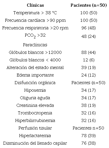 Con respecto a las variables clínicas, todos los pacientes sépticos presentaron temperatura >38oC y una frecuencia cardíaca >100 latidos por minuto, el 96 % una frecuencia respiratoria >20 respiraciones por minuto, 38 % alteración del estado mental y 24 % edema importante. Un 26 % de los pacientes padecía de hiperglucemia, 88 % leucocitosis y 12 % leucopenia. El análisis de las variables hemodinámicas mostró que un 16 % de los pacientes tenía una presión arterial sistólica (PAS) < 90 mm Hg. Entre las variables de disfunción orgánica, el 34 % de los pacientes presentó hipoxemia, 34 % oliguria aguda, 38 % creatinina elevada, 32 % trombocitopenia y 16 % hiperbilirrubinemia. Con respecto a las variables de perfusión tisular, un 78 % de los pacientes mostró hiperlactatemia y un 76 % disminución en el llenado capilar (tabla 3).
