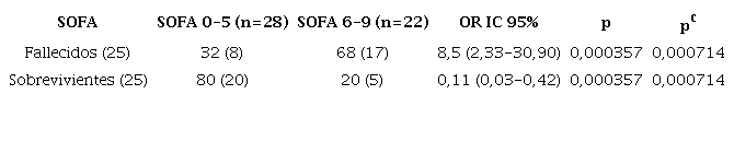 Al relacionar la mortalidad y la escala SOFA, se observó en el grupo de pacientes con escala SOFA en el rango entre 6-9 una mayor frecuencia de fallecimientos con respecto al grupo de pacientes con escala SOFA en el rango entre 0-5 (68 % vs. 32 %, respectivamente, OR: 8.5; IC 95 %: 2.3330.90, p= 0,000357, pe: 0,000714) (tabla 4).