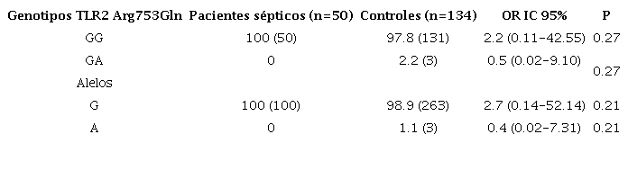 En el grupo de individuos aparentemente sanos se confirmó la existencia del equilibrio de H-W para la distribución genotípica del polimorfismo TLR2 Arg753Gln. Al asignar los genotipos, en el grupo de pacientes sépticos solo se identificó el genotipo homocigoto silvestre (GG) y en los controles dos genotipos: el homocigoto silvestre (GG) y el heterocigoto (GA). En ambos grupos estaba ausente el genotipo homocigoto mutado (AA). Al establecer la comparación de frecuencias geno-típicas y alélicas, entre pacientes y controles, no se observaron diferencias significativas (tabla 5).