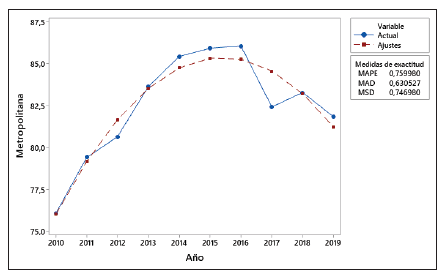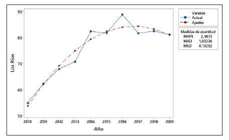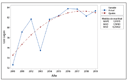 Estadística: se calculó la media, desviación estándar y los valores mínimos y máximos de las tasas de uso de GES y de la eficacia del tratamiento por año y región. La media de la tasa del uso del GES y la tasa de eficacia en cada región se comparó con el valor de la tasa considerada como óptima de atención de embarazadas por GES y meta de eficacia (100 y 68 %, respectivamente), mediante la prueba t-student. Las tasas estimadas por año en cada una de las regiones fueron estudiadas mediante series de tiempo (ecuaciones de regresión). Se estimó el error porcentual absoluto medio (MAPE), desviación absoluta de la media (MAD) y desviación cuadrática media (MSD) 17. Se utilizó el programa Minitab 18.0 y SPSS 25.0. Significación estadística: α < 0,05.
