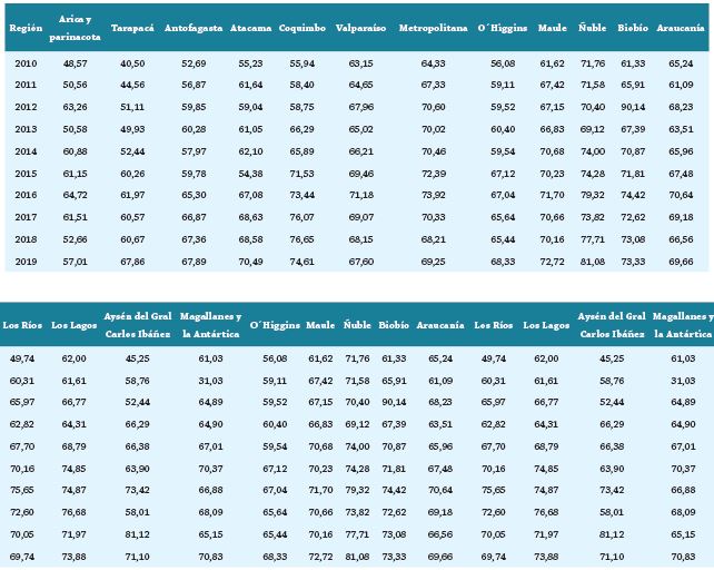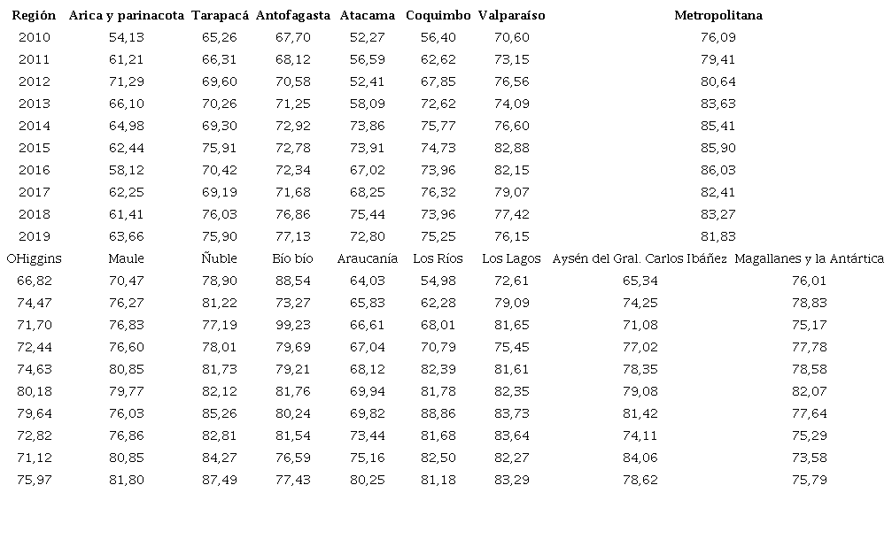 Patients and methods: Design: Descriptive, observational. Participants: Pregnant women, cared for in the public system. The total of pregnant women (1,854,621), pregnant women admitted to the GES (1,445,903), and pregnant women with full dental discharge (1,257,775) belonging to each of the regions and years analyzed (2010-2019) were studied. Measurements: estimation of dental GES use rates, evolution of rates over time using time series (regressions).