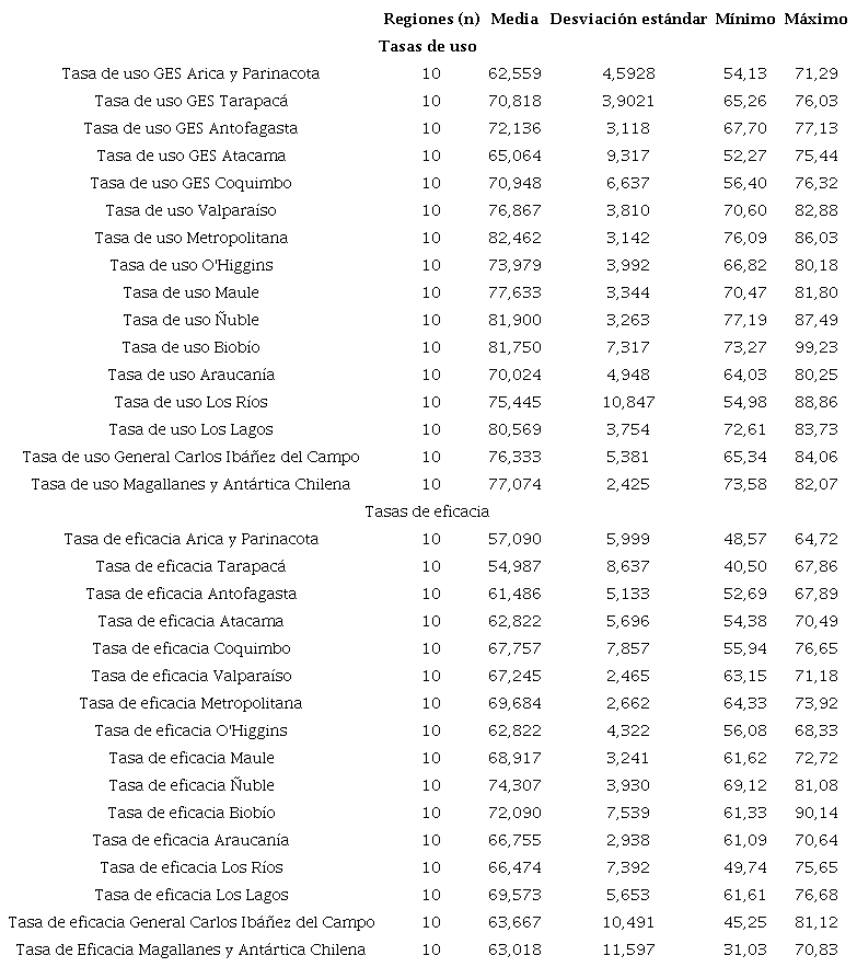 Resultados: Las medias del uso del GES y la eficacia de la atención por GES fue inferior al valor óptimo (100 %). Ambas tasas difieren del valor meta de la autoridad sanitaria. Los valores de las tasas del uso del GES varían por año y región. La forma de las curvas fue predominantemente no lineal.
