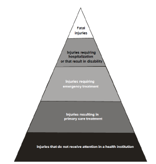 Given the impact of injuries on the health status of diverse populations, it is not surprising that addressing injuries is a high priority for public health and medical professionals worldwide. The injury pyramid illustrates the burden of injuries on health care systems, and it provides a visual representation of the scale and severity of injuries for any given region. It should be noted that the shape of the injury pyramid is determined by factors including the cause of injury, quality of data, and access to health care services (see Figure 1).