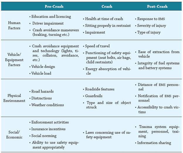 The Haddon Matrix also incorporates all three levels of prevention, ranging from passive restraint systems in vehicles, such as airbags, to adequate response time by emergency medical technicians (EMTs). The United States National Transportation Safety Administration provides an example of this approach as related to motor vehicles (see Table 2).