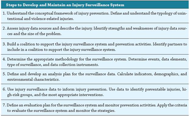 Despite their similarity with infectious and chronic diseases, unintentional injuries have characteristics that must be considered in surveillance systems. The " Steps to Develop and Maintain an Injury Surveillance System" proposed by Espitia-Hardeman & Paulozzi 47 provide a recommended structure for its implementation (See Table 3).