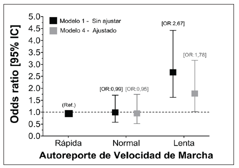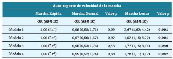 Resultados: En comparación a las personas mayores que reportaron una velocidad de marcha rápida, aquellas que reportaron una marcha lenta presentaron 2,67 veces mayor probabilidad de tener deterioro cognitivo (OR: 2,67 [95% IC:1,62; 4,42], p<0,001). Al ajustar los modelos por variables de confusión sociodemográficas, estilos de vida y salud, la asociación disminuyó, pero, permaneció significativa (OR: 1,78 [95% IC:1,15; 3,17], p=0,047). Mientras que las personas mayores que reportaron tener una velocidad de marcha normal no presentaron asociación con deterioro cognitivo.