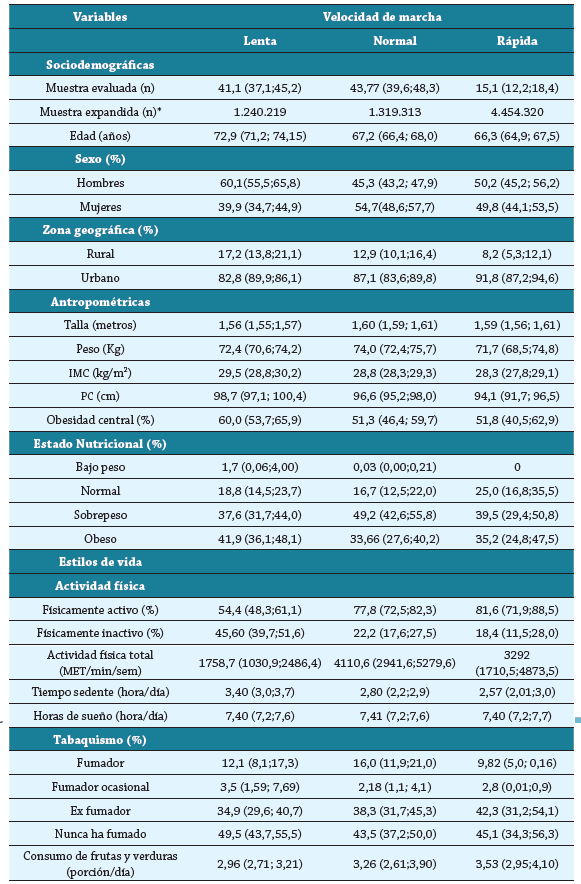Las características generales de la población estudiada según velocidad de la marcha se muestran en la tabla 1. Se evidenció que los participantes que reportaron una marcha lenta fueron predominantemente hombres (60,1 %) y personas mayores con zona de residencia urbana. En cuanto a las características antropométricas, los participantes con velocidad de marcha lenta presentaron mayor IMC, PC y mayor prevalencia de obesidad y obesidad central, además de reportar un mayor tiempo sedente y menor consumo de frutas y verduras (tabla 1).