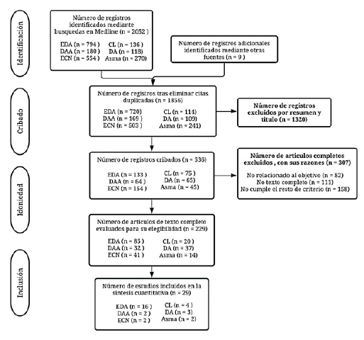 Estrategia de búsqueda: La búsqueda se realizó en las bases de datos MEDLINE, con los siguientes términos (MeSH). La estrategia incluyó las siguientes palabras (diarrhea and probiotics) and (children or pediatrics), (antibiotic-associated diarrhea and probiotics) and (children or pediatrics), (necrotizing enterocolitis and probiotics) and (infant or newborn), (infant colic and probiotics) and (children or pediatrics), (atopic dermatitis and probiotics) and (pregnancy or newborn), (asthma and probiotics) and (children or pediatrics). Los criterios de selección incluyeron artículos originales, metaanálisis, revisiones sistemáticas, ensayos clínicos y revisiones de tema que reportan mecanismos de acción o protocolos de manejos de las enfermedades seleccionadas con probióticos, publicados en idioma inglés y español, realizado entre 1994 a junio de 2020 y artículos disponibles a texto completo. Los criterios de exclusión fueron artículos duplicados, publicados en otros idiomas diferentes del inglés o español, estudios en líneas celulares y/o resúmenes, y publicaciones que no respondían la pregunta de investigación.