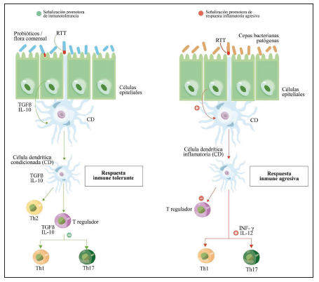 La interacción de la microbiota con el huésped comienza en las células de paneth, células epiteliales del yeyuno-íleon, colon y estómago, permitiendo la liberación de diferentes quimiocinas encargadas de propiciar una respuesta inflamatoria adecuada 28 algunas de estas moléculas proinflamatorias agonizan los receptores tipo toll (TLR); su expresión en los diferentes sitios, tanto transmembranales como intracelulares, esta regulada con mayor frecuencia por el factor de transcripción kappa-beta (NF-kB), como resultado, el paso a la inmunidad adaptativa con la activación de células T reguladoras 30.
