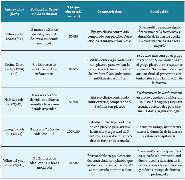 S. boulardii es una cepa de levadura considerada probiótico no patógeno, descubierta en 1920 por el biólogo francés "Henri Boulard" 39. De acuerdo con la búsqueda se encontraron estudios de Szajewska y cols. Analizaron 5 ensayos controlados aleatorios (ECA), con un total de 619 pacientes, entre los 2 meses y 12 años, con una dosis diaria de 250 hasta 750 mg, durante 5 a 6 días, y otras características se muestran en la tabla 1. Se comparó el uso de S. boulardii con placebo, y demostró un beneficio clínico terapéutico moderado en EDA, principalmente menor duración de la diarrea, con diferencia de medias ponderadas de 1,1 días (IC 95 %: -1,3 a -0,8). Los estudios incluidos fueron homogéneos (X2= 0,69, I2 = 0 %). No se demostró ningún efecto adverso severo 36-41.