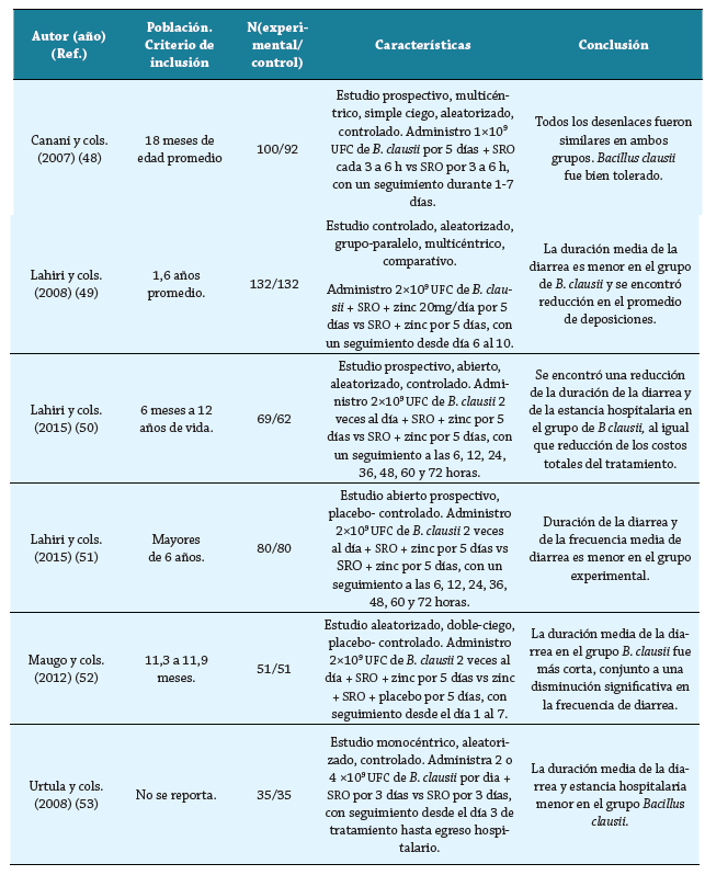 Es una bacteria Gram positiva, con la capacidad de estimular la actividad inmune y sobrevivir al tránsito gástrico y colonizar el intestino 46. Ianiro G. y cols. realizaron una revisión sistemática y metaanálisis de ECA para evaluar la eficacia del Bacillus clausii en el manejo de la diarrea aguda infantil 47; solo 6 ensayos cumplieron criterios de elegibilidad 48-53. Para el desenlace duración de la diarrea, el grupo control, con 441 participantes (sales de rehidratación oral [SRO], con y sin sulfato de zinc, vs. el grupo experimental, de 457 participantes (1 o 2 dosis diarias de B. claussi de 1-2X109 hasta 4x109 unidades formadoras de colonias (UFC) con SRO, con y sin sulfato de zinc). La tabla 2 resume las características de los estudios incluidos en la revisión, publicados entre 2007 y 2015. Se encontró una reducción significativa en la duración de la diarrea; diferencia de medias fue de -9,12 horas (IC 95 %: -16,49 a -1,75), además con una heterogeneidad leve (I2 = 63,4%, test de Cochrane, p = 0,02) 46. En tres ensayos clínicos se demostró el acortamiento de la duración de hospitalización; diferencia de medias fue de -0,85 días (IC 95%: -1,56 a -0,15) en pacientes que recibieron B. claussi comparado con SRO con zinc y este (I2 = 71,3 %, test de Cochrane, p = 0,03) 50,52-53. Por consiguiente, el B. claussi podría representar una opción terapéutica eficaz en la diarrea aguda infantil, con un buen perfil de seguridad 47-53. Otros estudios han demostrado evidencia controversial.