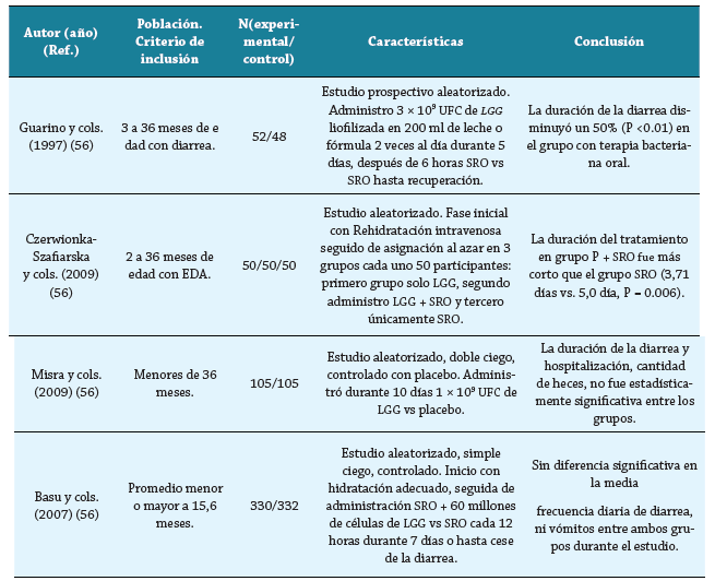 Las tres patologías más discutidas revisadas en los estudios incluidos en esta revisión sistemática son la enfermedad diarreica aguda, enterocolitis y cólico del lactante. En Colombia, la EDA produce 1,3 millones de muertes anuales en niños menores de cinco años. Se demostró un beneficio clínico moderado de menor duración de la diarrea con el uso de S. boulardii, con diferencia de medias ponderada de 26,4 horas (1,1 días) (IC 95 %: -1,3 a -0,8), con Bacillus clausii , una diferencia de medias de -9,12 horas (0,38 días) (IC 95%: -16,49 a -1,75) y con LGG de 20,4 horas (-0,85 días) (IC 95%: -1,15 a -0,56) vs. placebo.