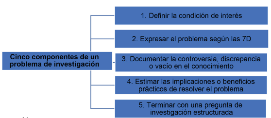 Muchas veces se tiene la idea errónea de que un problema de investigación es la ausencia de conocimiento. Sin embargo, el planteamiento del problema de investigación va más allá y está compuesto por cinco pasos 2,3: