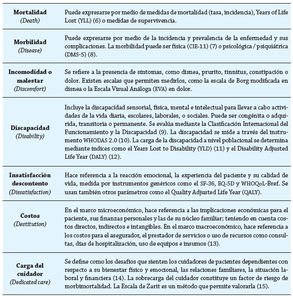 El segundo paso consiste en establecer el problema como una situación adversa o desfavorable, que puede ser expresada en términos de mortalidad, morbilidad, malestar, discapacidad, deterioro de la calidad de vida, costos y carga de la enfermedad 4. Esta situación puede ser negativa desde la perspectiva del paciente, su pareja, núcleo familiar, institucional o la sociedad y se presenta a nivel local, nacional o internacional 2,3. Los términos en los cuales se puede expresar un problema se resumen en la tabla 1, modificando la clásica mnemotecnia de las "6 D" (en inglés, death, disease, discomfort, disability, dissatisfaction, destitution), a la cual se le adiciona una séptima variable para la carga del cuidador (en inglés, dedicated care)4,5.