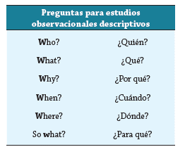En general, las preguntas de investigación se clasifican en preguntas de fondo (background) y específicas (foreground). Las preguntas generales sobre un problema clínico o una enfermedad se denominan "preguntas de fondo". Estas preguntas suelen plantear el qué, cuándo, cómo, por qué y dónde de la condición o el tratamiento, con la mnemotecnia de las "6 W" (en inglés, who, what, why, when, where y so what). Este tipo de preguntas pueden responderse realizando estudios observacionales descriptivos 20-22.