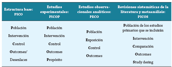 La estructura PICO es el formato más conocido para desarrollar preguntas de investigación de tipo foreground, aplicando para estudios de investigación que aborden los temas de etiología, diagnóstico, tratamiento o pronóstico, en la cual se debe incluir la población, pacientes o problema que se va a estudiar, la intervención o la exposición que se va a evaluar, el control contra el cual se va a comparar y, por último, los "outcomes" o desenlaces que se van a tener en cuenta durante el estudio 23. Se resalta que, según el tipo de pregunta de investigación que se esté realizando y la intención de la misma, se pueden incluir o cambiar algunas letras de la estructura PICO base 24. El investigador debe tener claro la razón por la cual escoge cada uno de los componentes de su pregunta de investigación y dichas justificaciones deben estar basadas en la evidencia disponible hasta el momento.