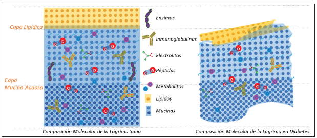 La lágrima hace parte de los fluidos biológicos corporales y está compuesta por una amplia gama de moléculas tales como las proteínas, péptidos, electrolitos, enzimas, inmunoglobulinas, lípidos y metabolitos, que necesitan un equilibrio para garantizar una función adecuada y para mantener la integridad biofísica de la película lagrimal. En consecuencia, las alteraciones en su equilibrio generan cambios en la homeostasis de la superficie ocular, manifestando diversas afecciones, como ojo seco, blefaritis, entre otras 24.