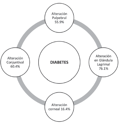 De igual manera, Machín (2017) sugirió que en la DM tipo 2, las estructuras oculares más afectadas debido a esta patología sistémica son la glándula lagrimal (76.1 %) y en segundo lugar la conjuntiva (60.4 %), que han demostrado una gran prevalencia de disfunción en la producción lagrimal 29 (Figura 2). Además, se ha descrito la existencia de un alto porcentaje de prevalencia de DM en mujeres y personas mayores de 50 años, no obstante, se menciona que en muchos casos no se suele relacionar la edad ni el género, con la prevalencia de DM 2. De acuerdo con lo anterior, las personas con DM tienen más probabilidades de sufrir la enfermedad de ojo seco, especialmente aquellas que no están adheridas a un tratamiento, lo cual induce un incremento en la glucemia que da como resultado una repercusión mayor en las glándulas implicadas en la producción de lágrimas 29.