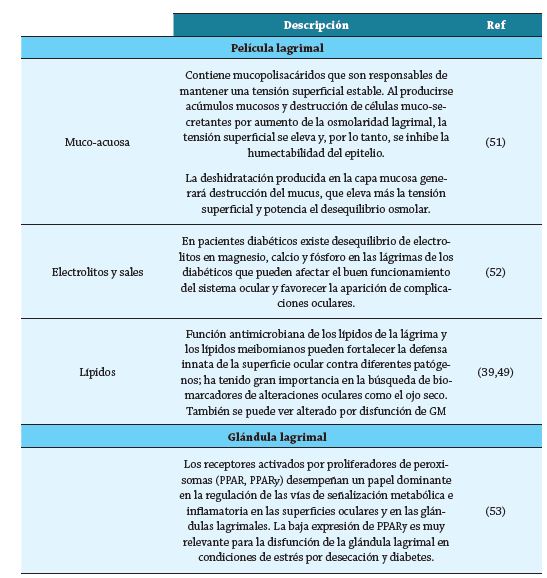 Por tal razón, varias investigaciones no solo han considerado la película lagrimal, como un fluido interesante para evaluar algunos biomarcadores de la DM, sino que ponen énfasis en algunas alteraciones que se pueden presentar en la superficie ocular y que contribuyen al desarrollo de ojo seco 19. En este sentido, análisis invitro han demostrado que distintos tipos celulares en la superficie ocular requieren de una actividad metabólica de glucosa adecuada, y al generar cambios en dicha condición contribuyen a distintivas vías de señalización celular que favorecen el estrés oxidativo, desregulación de la actividad del óxido nítrico, disfunción mitocondrial e inflamación ocular, eventos biológicos que se presentan en la DM 41,42.