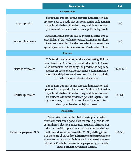 Los pacientes diabéticos se quejan con frecuencia de síntomas típicos del ojo seco, como ardor y sensación de cuerpo extraño. Los hallazgos clínicos más frecuentes y medibles son: la secreción lagrimal reducida, la inestabilidad de la película lagrimal y la reducción de la sensación corneal. La afectación de las demás estructuras son determinantes en la etiología del ojo seco, ya que van a causar un aumento en la osmolaridad de la lágrima e inflamación de la superficie ocular, lo cual se produce por causa de la inflamación en la glándula lagrimal reduce la estabilidad y equilibrio de la lágrima, lo cual disminuye la protección natural de la superficie ocular 30.