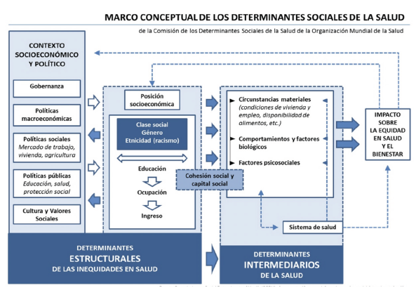 Bajo la lógica de los DSS 2, la interacción entre factores estructurales, como el contexto socioeconómico y político de un país, las normas y valores culturales imperantes de la sociedad y la posición social, determinan la existencia de individuos expuestos a mayores consecuencias negativas en salud. Uno de los grupo en esta situación de desventaja social son las personas migrantes internacionales 5.