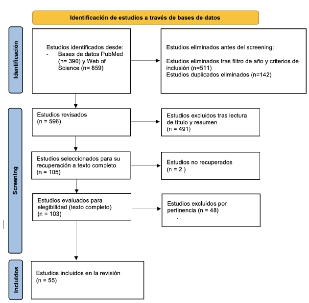 El proceso de selección de artículos se presenta en la figura 2. Del total de artículos identificados (n=1259), un total de 55 fueron incluidos en esta revisión. La totalidad de los artículos seleccionados cumplió con los criterios de calidad metodológica descritos por MMAT.