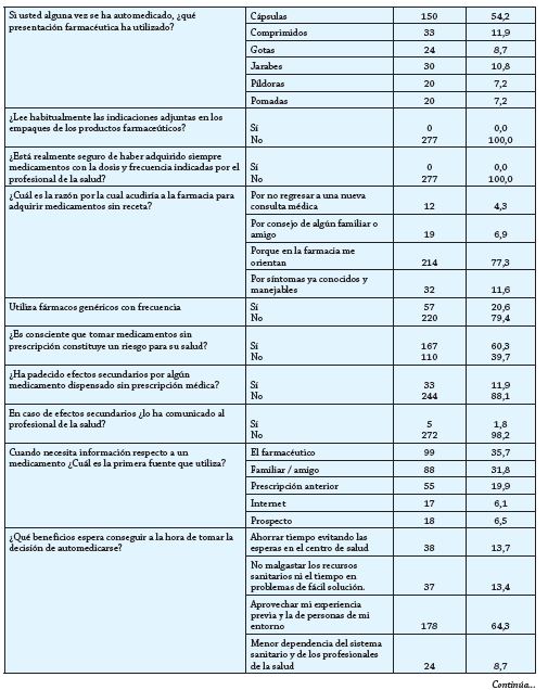 En lo referente al nivel de automedicación de los pacientes, 231 (83,4 %) manifestaron haber tomado algún medicamento por su cuenta, y en ese sentido, 253 (91,3 %) indicaron tomar medicamentos por lo general cuando se sienten mal de salud. Sobre ese marco, 213 (76,9 %) afirmaron tomar medicamentos todos los dias. De acuerdo al motivo principal del porqué se auto medican, 67 (24,2 %) respondieron que lo hacen por el difícil acceso a los servicios sanitarios, 54 (19,5 %) respondieron que no le gusta ir al médico y 41 (14,8 %) sostuvieron que se auto medican debido a que tienen conocimiento previo suficiente para hacerlo. Por otro lado, 141 (50,9 %) afirmaron que acuden a consulta médica solo cuando tienen algún malestar que les impide realizar sus actividades cotidianas; sin embargo, solo 54 (19,5 %) afirmaron padecer de alguna enfermedad diagnosticada siguiendo estrictamente un tratamiento, mientras que igual porcentaje indicó que consume medicamentos solo por tratamiento médico controlado. Respecto a los beneficios que esperan conseguir al auto medicarse, 178 (64,3 %) afirmaron aprovechar su experiencia previa y la de personas de su entorno, 38 (13,7 %) señalaron ahorrar tiempo evitando las esperas en los hospitales y 37 (13,4 %) afirmaron evitar que se malgasten los recursos sanitarios y el tiempo en problemas de accesible solución. En cuanto a la via de administración utilizada, 197 (71,1 %) han empleado la via oral, 27 (9,7 %) la via inhalatoria, 32 (11,6 %) la via tópica y 21 (7.6 %) la via intramuscular. En cuanto al tipo de medicamento que han consumido con mayor frecuencia, la mayoría, correspondiente a 47 (17 %) ha consumido analgésicos y antibióticos; 28 (10,1 %) solo antibióticos y 27 (9,7 %) antidepresivos y analgésicos. De igual manera, al precisar respecto a la presentación farmacéutica de mayor frecuencia, 150 de ellos (54,2 %) respondieron que fueron las cápsulas; 33 de los encuestados también mencionaron los comprimidos, con un 11.9 %, y los jarabes, con 10,8 %. En una realidad sumamente preocupante, el 100 % de pacientes refirió no haber adquirido medicamentos con la dosis y frecuencia indicadas por el profesional de la salud; además, se observó que el 100% no lee habitualmente las indicaciones adjuntas en los empaques de los medicamentos. En ese contexto, 167 (60,3 %) se manifestaron como conscientes que tomar medicamentos sin prescripción constituye un riesgo para su salud y 33 (11,9 %) indicaron haber padecido efectos secundarios por algún medicamento dispensado sin prescripción. Frente a esta contrariedad, 272 (98,2 %) mencionaron no haber comunicado la ocurrencia de efectos secundarios al profesional de la salud.