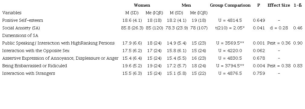 Differences in the variables of interest in this study, positive self-esteem and social anxiety, and their respective dimensions according to the gender of the participants were analyzed (see table 1).