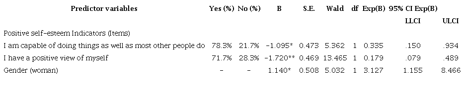 When relating the indicators of positive self-esteem to social anxiety experienced by university students during the pandemic, two of these indicators significantly and negatively predicted elevated levels of social anxiety, and gender was also a predictor variable. This model explained 16.4% (Cox and Snell R2) and 28% (Nagelkerke R2) of the total variance (see table 3). That is, when students have a positive view of themselves and feel capable of doing things as well as others, they experience lower levels of social anxiety. Being a woman was associated with a higher risk of experiencing elevated levels of social anxiety. These findings confirm the study hypothesis, supported by the coefficient (B) of the binary logistic regression and the results of the omnibus test of the model (Chi2 = 32.227; df = 2; p = 0.000).