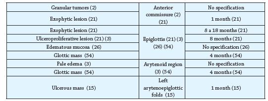 Among the findings of laryngeal biopsies, the main lesion of LTB most frequently mentioned are granulomas, followed by ulcerative lesions and nonspecific lesions 2,6,13. However, variability is reported, exophytic lesions, edema and glottic masses can also be found 1,3) (21, and in turn, these lesions are reflected in certain structures such as: the glottic region (true vocal folds, vestibular folds, anterior and posterior commissures) which is usually the most affected, followed by the supraglottic region (epiglottis, aryepiglottic folds) 3,20,6,8,15, affecting the quality of the voice, preventing its adequate production and causing great alterations 2,9,8,13,57.