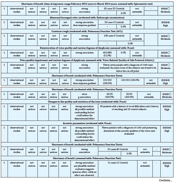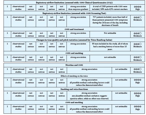 Initially, we classified the studies that were characterized by including tobacco consumption in adults with COPD, additionally, articles where the characteristics and effects of tobacco consumption on the voice as a cause of Organic Dysphonia in adults with COPD were shown, it was taken into account that these studies had characteristics and aspects such as: adult population with COPD, smoking history, manifestations of the population with respect to vocal and respiratory problems or alterations and thus give development to the research topic.