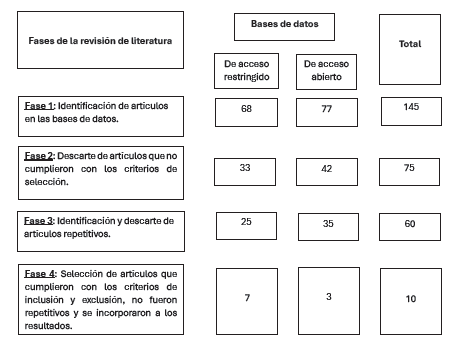 En el proceso de búsqueda se encontraron 7200 artículos, de los cuales se seleccionaron 145 que respondian a la pregunta de investigación. Las fases de revisión de la literatura fueron cuatro: 1) identificación de artículos en las bases de datos de revistas de investigación científica de acceso restringido (bases de datos con licencia Universidad Simón Bolivar) y de acceso abierto o de open access; 2) descarte de artículos que no cumplieron con los criterios de selección antes mencionados; 3) identificación y descarte de artículos que se identificaron como repetitivos en las bases de datos; y 4) selección de artículos que cumplieron con los criterios de inclusión y exclusión y no fueron repetitivos. Estas fases se presentan en la figura.