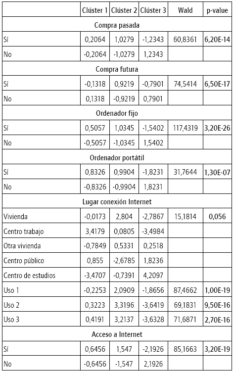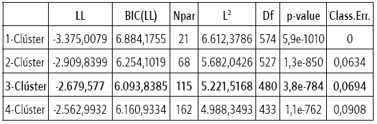 Las nueve variables que se utilizaron para la segmentación de clases latentes resultaron estadísticamente significativas según el test de Wald, que mide la capacidad discriminante de las variables utilizadas. En todos los casos resultaron p-valores por debajo de 0,05, excepto para la variable lugar de conexión a Internet que fue de 0,056, prácticamente en el límite del nivel de confianza del 95%. Esto nos indica que dichas nueve variables son buenas bases de segmentación (ver Tabla 2).