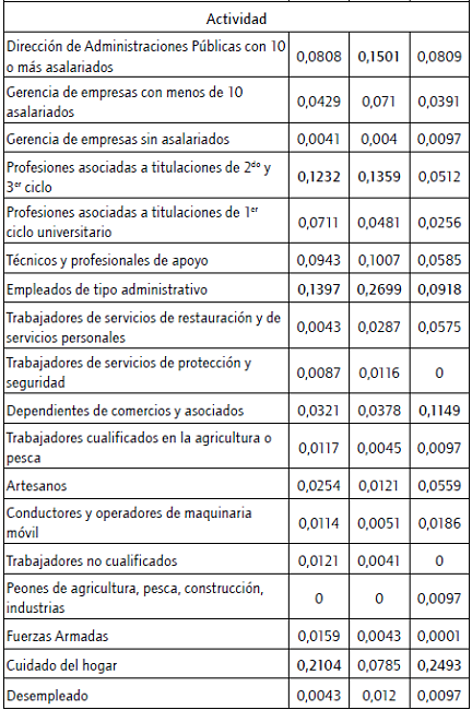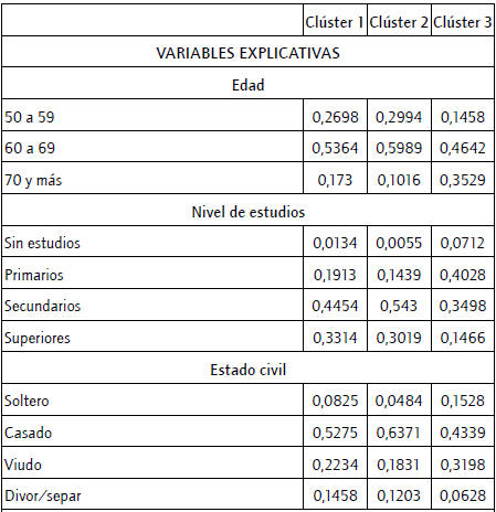 Así, respecto a la edad, los clústeres 1 y 2 son más parecidos en su estructura de edad, sin embargo en el clúster 3 parece haber un porcentaje mayor de personas por encima de los 70 años (35,29%) y menor de personas de 50 a 59 años (14,58%) que en los otros 2 grupos. También se aprecian diferencias significativas respecto al nivel de estudios. En el grupo 3 las personas con estudios superiores son solo un 14,66% menos de la mitad que en los otros 2 grupos y, sin embargo, el porcentaje de mayores con estudios primarios es del 40,28% mucho mayor que el de los grupos 1 y 2. Respecto al estado civil, aunque los casados son mayoría en los tres grupos, el porcentaje de viudos y solteros es significativamente mayor en el grupo 3 (31,98% y 15,28% respectivamente) que en el resto de conglomerados, y el de divorciados/separados sensiblemente inferior en este mismo grupo (6,28%). Con referencia a la actividad profesional desarrollada por los encuestados en el clúster 1 las tres principales son: cuidado del hogar (21,04%), empleados administrativos (13,97%) y profesiones asociadas a titulaciones universitarias (12,32%); en el grupo 2: empleados administrativos (26,99%), dirección de administraciones públicas con más de 10 empleados (15,01%) y profesiones asociadas a titulaciones universitarias (13,59%); en el conglomerado 3: cuidado del hogar (24,93%), dependientes de comercios y asociados (11,49%) y empleados administrativos (9,18%).