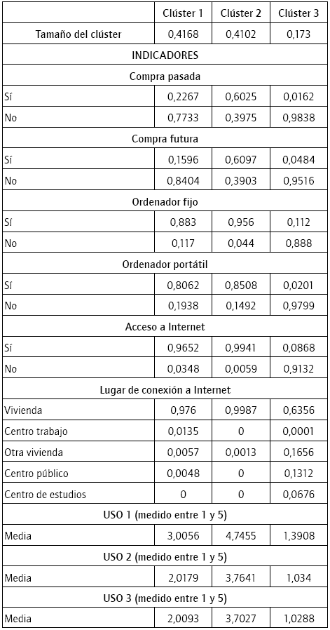 Seguidamente, se presentan los perfiles de los tres clústeres encontrados. Se comprueba en la Tabla 4, que los clústeres 1 y 2 son muy similares en tamaño (alrededor del 41% del total de la muestra cada uno), mientras que el clúster 3 solo cuenta con un 17,3% de la misma. Respecto a las compras tanto pasadas como futuras hechas por Internet, las personas incluidas en el clúster 1 indican que no las han realizado en un 77,33% y que no las harán en un 84,04%. Este porcentaje se incrementa en el caso del clúster 3 al 98,38% y 95,6% respectivamente, siendo este tercer grupo el más adverso a la compra por Internet. En el clúster 2, sin embargo, un 60,25% han hecho compras por Internet en el pasado, y en el futuro el porcentaje es muy parecido. Es destacable el hecho de que el grupo donde más compras online se producen son los que tienen en un mayor porcentaje ordenador fijo y portátil (por encima del 95% y 85% respectivamente) y mayor porcentaje de acceso a Internet (99,41%). Curiosamente, los miembros del clúster 1, que son poco compradores online, tienen un porcentaje muy alto de disposición de ordenador fijo y portátil (88,3% y 80,62% respectivamente), así como unos valores muy altos de acceso a Internet (96,51%). Al contrario, los miembros del clúster 3 son los que revelan una mayor brecha digital, ya que solo el 11,2% tiene acceso a un ordenador de sobremesa, el 2,01% dispone de ordenador portátil y apenas un 8,68% tiene acceso a Internet. El lugar prioritario de conexión a Internet es en su hogar para los 3 clústeres, aunque para las personas que conforman el 3 el acceso desde otra vivienda (16,56%) y desde centros públicos (13,12%) tiene cierto peso. Respecto al uso de Internet que se mide con tres ítems con escalas entre 1 (muy poca frecuencia) a 5 (mucha frecuencia), se observa claramente que los que más lo usan son los que pertenecen al clúster 2, es decir, los más compradores online, los mayores del clúster 1, tienen un uso intermedio, y los pertenecientes al clúster 3 que son los que menos compras online hacen, también son los que usan menos la red de redes.