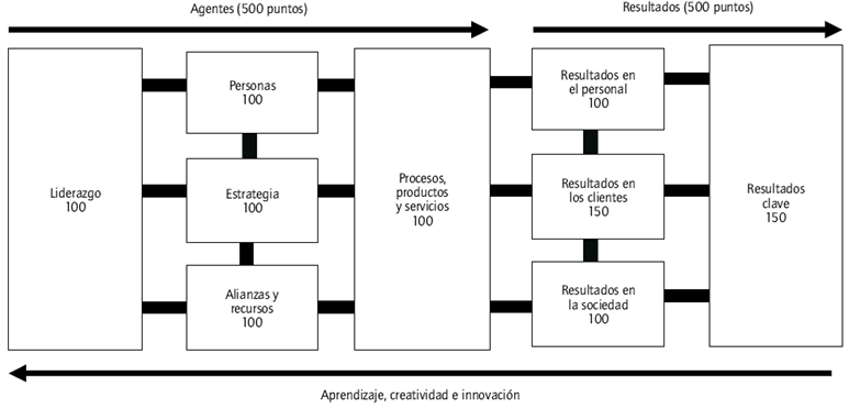 Los agentes se refieren a lo que la organización hace; los resultados se relacionan con lo que la organización logra. Cada uno de los criterios tiene un peso que en conjunto suman 1000 puntos. El total de puntos atribuidos a los agentes es de 500 y se distribuyen de la siguiente manera (Benavides y Quintana, 2003):