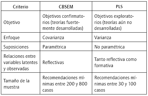 Para el análisis de los datos obtenidos mediante la aplicación de cuestionarios se utilizó un modelo de ecuaciones estructurales basado en mínimos cuadrados parciales (PLS, por sus siglas en inglés), el cual presenta ciertas ventajas frente a las técnicas basadas en la covarianza (Covariance-based Structural Equation Modeling - CBSEM), en cuanto a las exigencias de la distribución de las variables de la muestra, su tamaño y el tipo de variables (Gefen, Ringdon y Straub, 2011). La Tabla 1 muestra un comparativo entre los dos tipos de ambos enfoques.