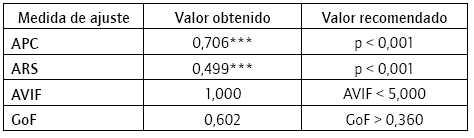 A partir de lo anterior, puede afirmarse que este modelo de medida es adecuado para proceder con la evaluación del modelo estructural y, de esta forma, analizar las relaciones propuestas entre los constructos.