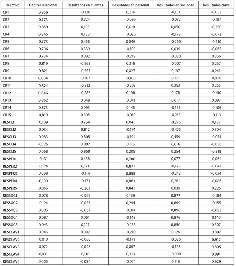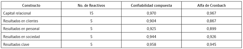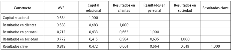 La validez convergente evalúa si los diferentes ítems de un constructo miden realmente lo mismo, por lo que el ajuste será significativo y estarán altamente correlacionados. Para esto, se calculó la AVE, pues proporciona la cantidad de varianza que un constructo obtiene de sus indicadores con relación a la cantidad de varianza debida al error de medida. Fornell y Larcker (1981), desarrolladores de esta técnica, sugieren que la AVE sea al menos de 50%. Para el caso del modelo evaluado, el valor más bajo de AVE es para el constructo resultados en clientes (68,30%), lo cual indica que existe validez convergente en todos los componentes (Tabla 5).
