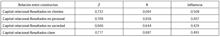 Adicionalmente, los coeficientes β en todos los casos resultan positivos y con valores elevados, siendo el menos fuerte el que evalúa la influencia del capital relacional en los resultados en la sociedad (0,666). El análisis Bootstrap ejecutado con 500 submuestras de acuerdo con la recomendación de Chin (1998, 2010a), evidencia que todos los coeficientes son significativos a un nivel de 0,001.