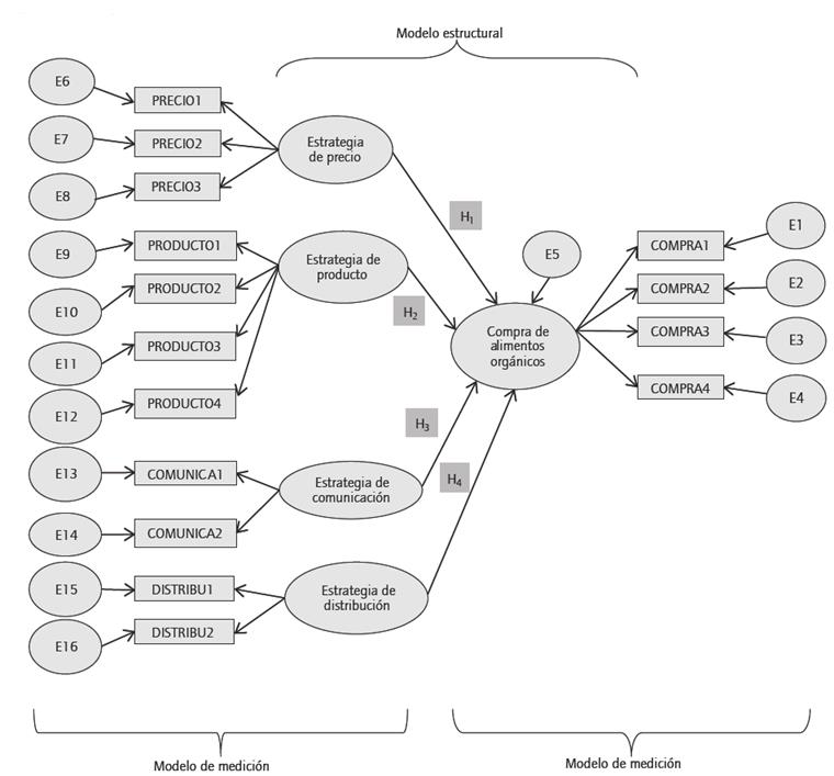 El caso aquí presentado es un SEM conformado por el modelo estructural y el modelo de medición, que estudia la relación entre el constructo (variable latente), que es la compra de productos orgánicos, representado teóricamente por cuatro variables observables (ítems) con cuatro constructos; estrategia de precio, estrategia de producto, estrategia de comunicación y estrategia de distribución, con sus respectivos indicadores (Figura 1). Con el objetivo de aportar evidencia del mercado de consumidores mexicanos respecto al mix de marketing y su influencia en la compra de alimentos orgánicos, los criterios que se tomaron en cuenta para su aplicación obedecen a la evaluación de una teoría abundante sobre el comportamiento del consumidor de compra de dichos alimentos (constructo indeterminado) y del marketing estratégico, operando con indicadores reflectivos. El tamaño muestral es mayor a 200 sujetos (n = 383, nivel de confianza 95,5% y margen de error 5+) y la población objetivo fueron consumidores de alimentos orgánicos de 18 a 65 años. El levantamiento de datos se realizó en marzo del 2012. El instrumento de medida después del estudio piloto (validez de contenido y validez aparente) queda compuesto por 15 ítems (escala Likert de 5 puntos), más los datos sociodemográficos. El desarrollo del modelo se realizó con el paquete informático estadístico SPSS-AMOS. Las hipótesis a comprobar fueron las siguientes: