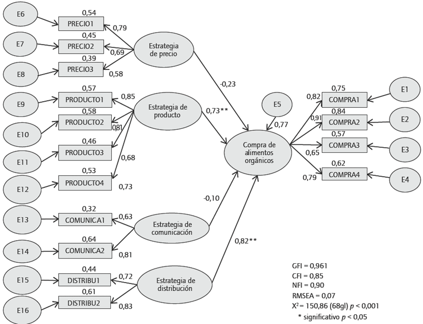 A partir de los resultados analizados en cada caso, se puede proponer una serie de implicaciones empresariales que permiten, por tanto, una comprensión más profunda de la existencia de diferentes relaciones entre las dimensiones integrantes, así como en las consecuencias que tiene en la respuesta por parte del consumidor, por ejemplo, en la aplicación de SEM la teoría es abundante y se pretende conocer si las estrategias de marketing (precio, producto, comunicación y distribución) influyen en la compra de alimentos orgánicos. Los hallazgos indican que las estrategias de producto y distribución tienen una relación causal significativa, es decir que influyen en la compra de alimentos orgánicos. Por otro lado, las estrategias de precio y de comunicación tienen una relación causal significativa pero inversa, lo cual puede significar que los consumidores perciben ambas estrategias como negativas (altos precios en los productos y campañas comunicacionales poco creíbles). Es evidente que las estrategias de precio hasta hoy utilizadas deben reforzarse, así como aquellas actividades de comunicación de los alimentos orgánicos deben hacer uso de claims ambientales para generar confianza en el consumidor.