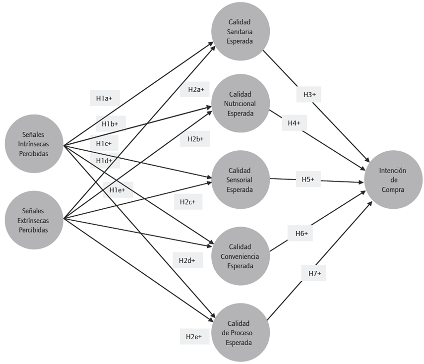 El caso aquí presentado es un modelo conceptual PLS que intenta cuantificar la intención de compra que manifiesta el consumidor de jamón curado español, a partir de la evaluación de la calidad esperada y las señales intrínsecas y extrínsecas percibidas (Figura 3). Los criterios que se tomaron en cuenta para la aplicación de PLS obedece al poco desarrollo teórico de la calidad esperada; por lo tanto, se emplean constructos determinados (indicadores libres de error) y se pretende medir la predictibilidad. Para el modelado se utilizó el paquete informático estadístico PLS-Graph, versión 3.00.