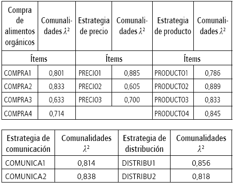 El primer paso para validar el modelo de medida fue analizar la validez de contenido (revisión de literatura de las escalas) y la validez aparente (adaptación de las escalas). Como segundo paso, se lleva a cabo el análisis de fiabilidad del ítem, haciendo un análisis factorial exploratorio y confirmatorio. En el primero se depuraron las escalas y sus ítems; para los constructos reflectivos, estos deben poseer una carga factorial (λ) igual o superior a 0,707 (Carmines y Zeller, 1979; Cepeda y Roldán, 2004), aunque hay autores que indican una carga de λ ≥ 0,5 (Hair, Anderson, Tatham y Black, 1999). Por lo tanto, no se depura ningún indicador, pasando al AFC. (Tabla 1). Al estimar la comunalidad (λ2), parte de la varianza explicada por el constructo, la primera variable COMPRA1 tiene una carga de λ2 = 0,801, lo que significa que el 80% de la varianza está asociada al constructo compra de alimentos orgánicos. Sharma (1996) establece como límite de aceptación el valor de 0,5, pues un indicador debe tener al menos el 50% de su varianza en común con la variable latente.