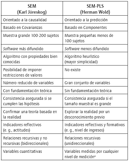 Una de las diferencias fundamentales entre los métodos es la orientación, es decir, el SEM se enfoca a medir la causalidad y PLS, a la predicción, basándose el primero en covarianzas y el segundo, en componentes. Mientras que la causalidad garantiza la capacidad de controlar los acontecimientos, la predictibilidad permite solo un limitado grado de control (Falk y Miller, 1992). La gran ventaja del SEM es que permite proponer el tipo y dirección de las relaciones (unidireccionales y bidireccionales) que se espera encontrar entre las diversas variables contenidas en él, para pasar posteriormente a estimar los parámetros que vienen especificados por las relaciones propuestas a nivel teórico (Ruiz et al., 2010).