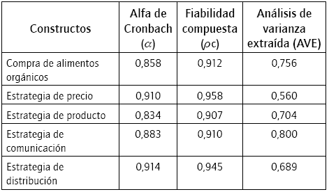 Se ha analizado la fiabilidad del constructo por medio del alfa Cronbach (α) y la fiabilidad compuesta del constructo (ρc). En la Tabla 6, se observa que el alfa de Cronbach es mayor a 0,7 en todos los casos, tal y como proponen Nunnally (1978). En cuanto a la fiabilidad compuesta (ρc), propuesta por Werst, Linn y Jöreskog (1974), son superiores que los valores de alfa de Cronbach para cada uno de los constructos propuestos (Fornell y Lacker, 1981) y mayores de 0,6 (Chin, 1998; Steenkamp y Geyskens, 2006). Por tanto, se podría decir que los constructos planteados poseen una consistencia interna satisfactoria.