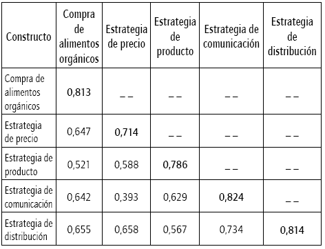 Según Fornell y Larcker (1981), un constructo está dotado de validez discriminante si su AVE es mayor que las correlaciones al cuadrado entre este constructo y los demás que forman el modelo, e indica que un constructo es diferente a otro. Por tanto, los valores del AVE (Tabla 3) también se consideran aceptables, dado que superan el valor 0,5 (Hair et al., 1999) (valores sobre la diagonal). Todos los indicadores se ajustan de forma aceptable de acuerdo con los principios establecidos, garantizando la validez discriminante de los constructos.