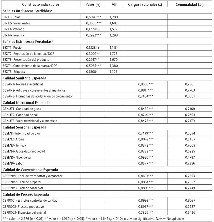 Para el caso de la fiabilidad individual de los indicadores de los constructos formativos (señales intrínsecas percibidas y señales extrínsecas percibidas), se ha estimado la significatividad de los pesos (π) usando la técnica de remuestreo o bootstrapping (Chin, 1998). La mayoría de los indicadores son significativos y su peso es mayor a 0,1 (Seltin y Keeves, 1994). En referencia a los indicadores SINT_1: El color del Jamón es adecuado (π = 0,1729) y SEXT_1: Precio (π = 0,1328), estos fueron no significativos.