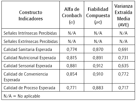 El primer paso para validar el modelo de medida fue analizar la validez de contenido (revisión de literatura de las escalas) y la validez aparente (adaptación de las escalas). El segundo paso consistió en calcular la fiabilidad individual del ítem por medio de las cargas factoriales (loading); para el caso de constructos reflectivos, estos deben poseer una carga factorial (λ) igual o superior a 0,707 (Carmines y Zeller, 1979; Cepeda y Roldán, 2004) y la significatividad de los pesos (weight) para los constructos formativos. Este criterio señala que la varianza compartida entre el constructo y los indicadores de este sea mayor que la varianza del error. Tomando como referencia el criterio de aceptación anterior (λ ≥ 0,707), no se depura ningún indicador. Para el caso específico del indicador CESEN_5: El nivel de sal creo que va ser el adecuado (λ = 0,6926) de la escala calidad sensorial esperada, no se ha depurado de acuerdo al criterio empírico de λ ≥ 0,5 de Hair et al. (1999), quienes establecen una fiabilidad del ítem satisfactoria para escalas nuevas, para escalas de medida que aún no tienen soporte teórico.